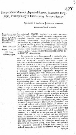 Всепресветлейшему державнейшему, великому государю, императору и самодержцу всероссийскому. Коммиссии о снабжении резиденции припасами всеподданнейший доклад. : [О доходах и расходах Московской столицы]; [Высочайше утвержденный 14 марта 1800 года доклад Комиссии о снабжении резиденции припасами]