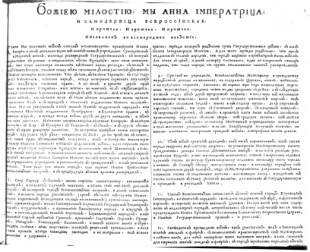 Текст начинается словами: Божиею милостию, мы Анна императрица, и самодержица всероссииская, и протчая, и протчая, и протчая. Объявляем во всенародное известие. Какое мы попечение имеем о пользе и благополучии, и разширении нашеи империи, о том довольно видно из наших новых учрежденеи...