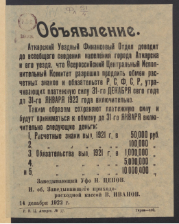Объявление, 14 дек. 1922 г.: [О продлении срока обмена денежных знаков : листовка / Аткарский уезд. исполнительный комитет Советов]