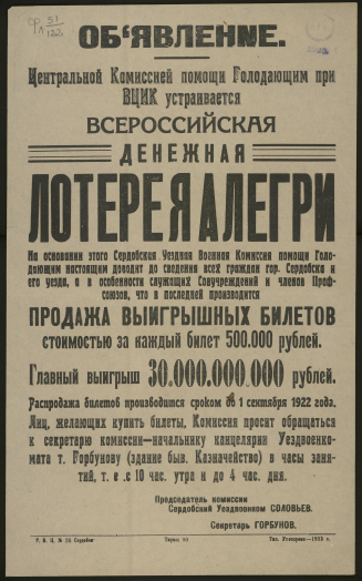 Объявление. "Центральной Комиссией помощи голодающим при ВЦИК устраивается Всероссийская денежная лотерея ..." : [листовка / Сердобская уезд. комиссия помощи голодающим]