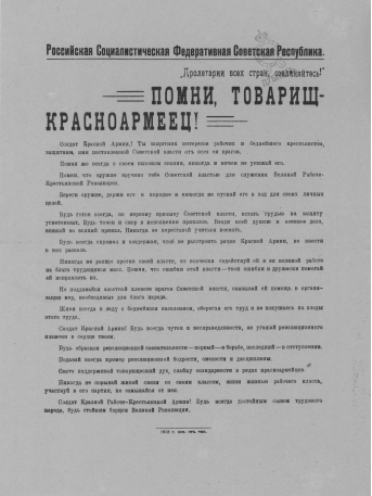 Помни, товарищ-красноармеец! "Солдат Красной Армии! Ты защитник интересов рабочих и беднейшего крестьянства..." : [листовка / Издательство ВЦИК]