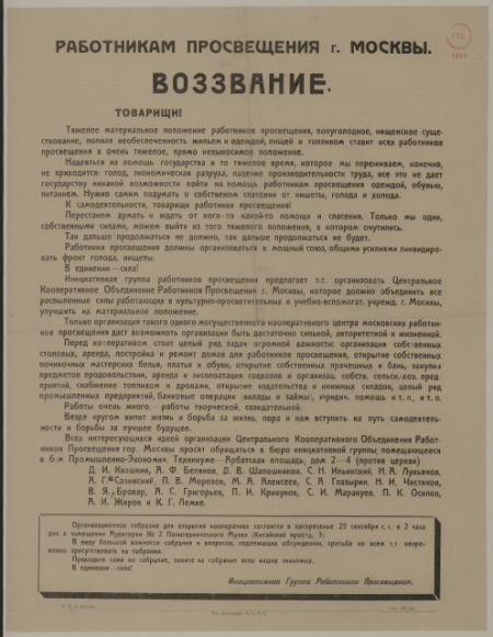 Работникам просвещения г. Москвы. Воззвание: [О создании Центр. кооп. объединения работников просвещения : листовка]