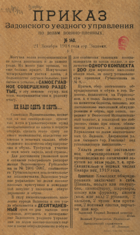 Подписи: задонский уездный военный комиссар Юдин; военный руководитель Кильчевский; заведывающий Управлением Н. Леонтьев