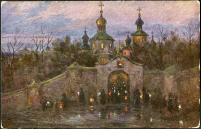 Вид на храмы православного монастыря и монастырские Святые врата с выходящими из них богомольцами с горящими свечами