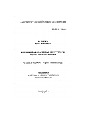 Историческая семантика в культурологии : (предмет и методы исследования); автореф. дис. на соиск. учен. степ. д. культуролог. н.; специальность 24.00.01 <Теория и история культуры> / Калинина Ирина Всеволодовна ; С.-Петерб. гос. ун-т