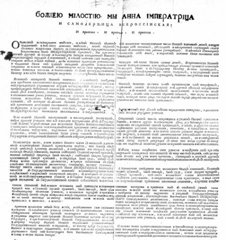 Текст начинается словами: Божиею милостию, мы Анна императрица и самодержица всероссииская, и протчая, и протчая, и протчая. Обьявляем во всенародное известие, и всем нашим верным подданным, и без того довольно известно, коим образом с самого вступления нашего на самодержавнои прародительскои всероссиискои наш императорскои престол, мы при толь многих других в пользу и благополучие империи и подданных наших непрестающих трудах и попечениях, и о