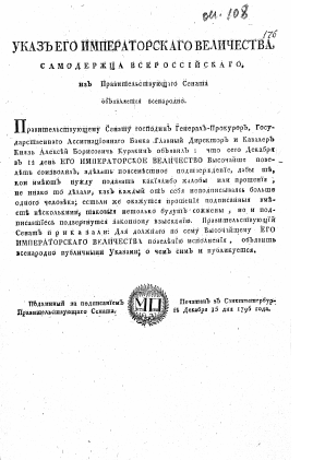 Текст начинается словами: Правительствующему Сенату господин генерал-прокурор, Государственнаго Ассигнационнаго банка главный директор и кавалер князь Алексей Борисович Куракин объявлял, что сего декабря в 12 й день...