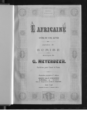 L’Africaine : Opera en cinq actes; Partition pour chant et piano / Paroles de Scribe; Musique de G.Meyerbeer