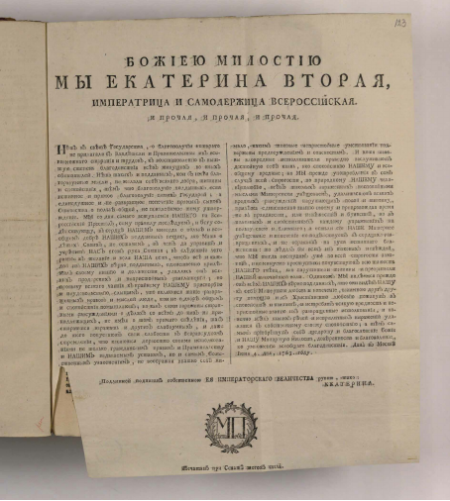 Текст начинается словами: Божиею милостию мы Екатерина Вторая, императрица и самодержица всероссийская. И прочая, и прочая, и прочая. Нет в свете государства, о благополучии котораго не прилагали бы владетели и правительствы их всевозможнаго старания и трудов...