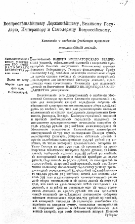 Всепресветлейшему державнейшему, великому государю, императору и самодержцу всероссийскому. Коммиссии о снабжении резиденции припасами всеподданнейший доклад. : [О доходах и расходах Московской столицы]; [Высочайше утвержденный 14 марта 1800 года доклад Комиссии о снабжении резиденции припасами]