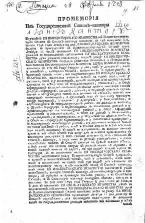 Промемория : [О вычете как у духовных, так и у военных, адмиралтейских, статских, придворных и протчих чинов из жалования за один год и об отсылке тех денег в Штатс-контору и об освобождении от вычет штаб и обер офицеров]; Из Государственной Статс-канторы