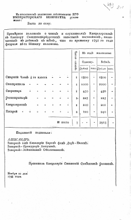 В конце текста: Подлинной подписали: Александр. Генерал от кавалерии барон фон Дер-Пален. Генерал-прокурор Лопухин. Генерал-лейтенант Обольянинов. Правитель Канцелярии статский советник Резанов. Ноября 22 дня 1798 года.