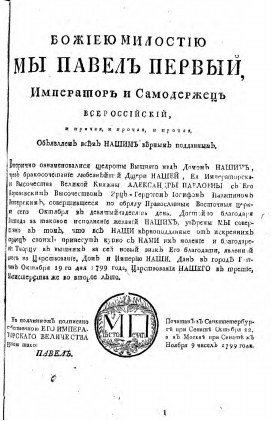 Текст начинается словами: Божиею милостию мы Павел Первый, император и самодержец всероссийский, и прочая, и прочая, и прочая. Объявляем всем нашим верным подданным. Вторично ознаменовалися щедроты вышняго над домом нашим, чрез бракосочетание...