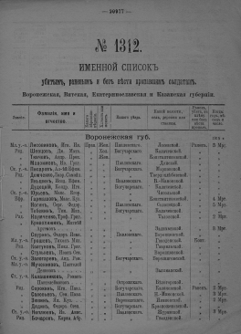 Именной список убитым, раненым и без вести пропавшим солдатам, [1914-1917]. № 1312, Воронежская, Вятская, Екатеринославская и Казанская губернии