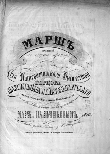 Марш, сочиненный по случаю проезда его императорского высочества герцога Максимилиана Лейхтенбергскаго чрез город Малмыж 1845, августа 30 и всенижайше посвященный Марк. Пальчиковым [Ноты]