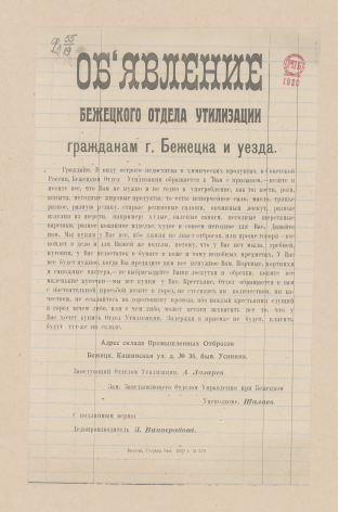 Организация: Бежецкий уездный отдел утилизации Автор (Вторич.): Шалаев, И. (участник местного управления, г. Бежецк), Подписавшее лицо ;