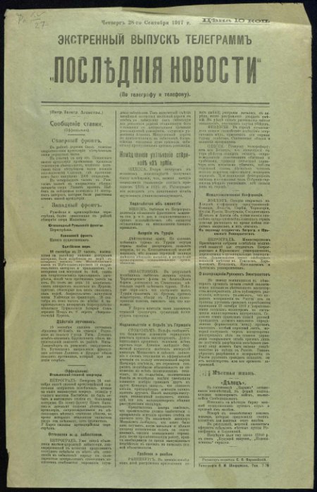 Экстренный выпуск телеграмм "Последние новости", четверг 28-го Сентября 1917 г.Сообщение ставки. (Официально). Северный фронт ... : (по телеграфу и телефону); [листовка]