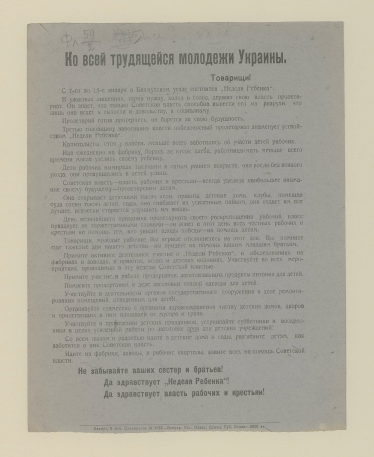 Ко всей трудящейся молодежи Украины. "Товарищи! С 7-го по 15-е января в Бахмутском уезде состоится "Неделя ребенка..." : [листовка]