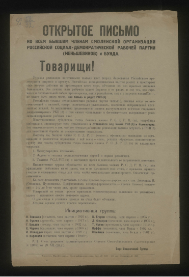 Открытое письмо ко всем бывшим членам Смоленской организации Российской социал-демократической рабочей партии (меньшевиков) и Бунда : [о созыве губ. съезда партии; листовка]