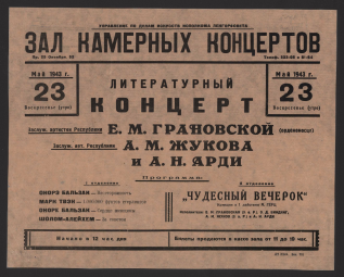 Литературный концерт Заслуж. артистки Республики Е. М. Грановской (орденоносца), Заслуж. арт. Республики А. М. Жукова и А. Н. Арди, май 1943 г., 23 Воскресенье (утро) : [афиша] / Управление по делам искусств Исполкома Ленгорсовета, Зал камерных концертов