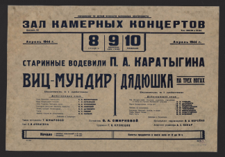 Виц-мундир: Водевиль в 1 действии. Действующие лица: Осип Осипович Разгильдяев - А.А. Виноградов; Иван Никанорович Гуторин - Г.К. Кузнецов; Анна Егоровна Любецкая, вдова - А.А. Толубеева; Григорий Сидорович Мелюзга, экзекутор - И.П. Новский; Фекла, кухарка Разгильдяева - А.К. де-Лазари; Слуга - А.С. Пикар; Фадеев, сторож из департамента - Н.К. Польяк. Действие в Петербурге. Дядюшка на трех ногах: Водевиль в 1 действии. Действующие лица: Лев Кондратьевич Сборский, полковник, городничий в одном из городов Тамбовской губернии - Н.К. Польяк; Марья Кондратьевна, сестра его - А.К. де-Лазари, Е.Г. Гаршина; Наташа, их племянница - М.А. Файбушевич, А.А. Толубеева; Владимир Иванович Луцкой, ее жених - А.А. Виноградов; Савва Саввич Филин - В.И. Колотушкин; Наум, слуга - И.П. Новский. Действие в Петербурге. Танцы поставлены Т. Шмыровой. Постановка О.А. Смирновой. Музыкальное сопровождение О.А. Норейко. Свет С.И. Ачкасова. Художник Г.К. Кузнецов. Ассистент режиссера А.С. Пикар.