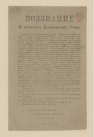 Воззвание к населению Даниловского уезда : [об охране телефонного и телеграфного имущества; листовка / Даниловский уезд. исполнительный комитет Советов]