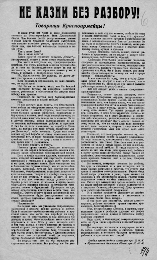 Организация (Альтер.): РСФСР, Центральный исполнительный комитет;РСФСР, Центральный исполнительный комитетДополнительное заглавие, применяемое каталогизатором: : Обращение: Товарищи красноармейцы! • Товарищи красноармейцы! • О дифференцированном подходе к пленным деникинцамЯзык: русский.Выходные данные: [Б. м. : б. и., 1918]Физическая характеристика: 1 с. в 2 стб. ; 19x34 см.Примечания: Подпись: Отдел пропаганды и агитации ЦИК и Крестьянская комиссия 50-ти при ЦИК; Обращение: Товарищи красноармейцы!.Содержание: О дифференцированном подходе к пленным деникинцам Предметная рубрика - Географическое наименование: РСФСР -- Политика и управление -- 1917 - 1925 -- Листовки Другие классификации: Т3(2)71-313,011 ; Т3(2)712.221,011Коллекции Электронной библиотеки: (21) Листовки -- (21) Листовки 1918 года Тип экземпляра: Книга