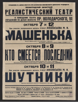 7 и 12 Октября при участии заслуженного артиста РСФСР Афанасьева М.И. Машенька: пьеса А. Афиногенова в 3-х действиях, 7 картинах. Постановка заслуженного артиста РСФСР Гуревич Г.Н. 8 и 9 Октября. Кто смееется последний: пьеса лауреата Сталинской премии Крапива в 3-х актах, 7 картинах. Постановка заслуженного деятеля искусств Чарова Н.И. В возобновлении Евдонова Н.Н. 10-11 Октября при участии заслуженного артиста РСФСР Афанасьева М.И. Шутники: картины московской жизни А.Н. Островского, в 3-х действиях. Постановка Колобова С.И. Состав труппы: Афанасьев М.И. (засл. арт. РСФСР), Борисова Т.А., Верховская Н.Д. [и др.]. Директор и худ. рук. С.И. Колобов. Зам. дирек. А.Ф. Кувшинов. Режиссер Н.Н. Евдонов. Зав. муз. частью М.М. Кононович. Гл. администр. И.Н. Куликов : [афиша] / Управление по делам искусств при Исполкоме Леноблсовета депутатов трудящихся, Ленинградский областной реалистический театр в помещении Театра управления по делам искусств пр. Володарского, 51