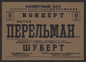 Концерт. Натан Перельман (ф-но). Шуберт, воскресенье, 8 апреля 1945 г. : [афиша]; при участии артистов филармонии: Летичевского Т. (скрипка), Калманович Г. Р. (альт), Немеринецкого Г. Р. (виолончель), Курбатов М. (контрабас) / Камерный зал Ленинградской Государственной Филармонии