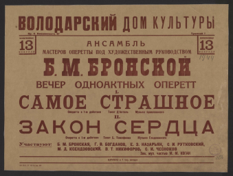 Ансамбль мастеров оперетты под художественным руководством Б.М. Бронской. Воскресенье 13 февраля. Вечер одноактных оперетт : участвуют: Б.М. Бронская, Г.В. Богданов, Е.Э. Назарьян [и др.]. Зав. муз. частью М.М. Коган; [афиша] / Володарский Дом Культуры