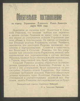 Обязательное постановление по Отделу управления Ачинского револ. Комитета, Марта 1920 г. : [об утверждении в отделе всех изменений в составе местных революционных комитетов; листовка]