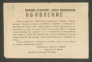Объявление. "Отдел Социального обеспечения Енисейского уездного революционного комитета доводит до всеобщего сведения..." : [листовка]