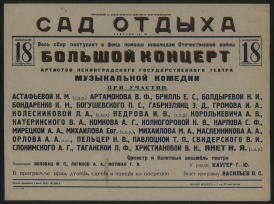 Большой концерт артистов Ленинградского государственного театра Музыкальной комедии. При участии: Астафьевой К.М. (з.а.р.), Артамонова В.Ф., Брилль Е.С. [и др.]. Оркестр и балетный ансамбль театра. Дирижеры: Воловац М.П., Логинов А.А., Фурман Г.В. У. рояля: Каугер Г.Ю. В программе арии, дуэты, сцены и танцы из оперетт. Ведет программу Васильев В.С., Понедельник 18, Сентябрь 1944 г. : [афиша] / Управление по делам искусств Ленсовета Ленгорисполкома, Сад отдыха