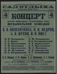 Концерт артистов Ленинградского государственного театра музыкальной комедии. Август, 4 пятница [1944 года] : участвуют: заслуженный артисты РСФСР Л.А. Колесникова, И.В. Кедров, А.А. Орлов, Н.Я. Янет. Артисты Н.И. Болдырева, Е.С. Бриль, Н.В. Колногорова [и др.]. Солисты балета Н.В. Пельцер, Л.М. Лидина, Л.Д. Бейзельман, А.Г. Комков. Симфонический оркестр Театра музыкальной комедии, дирижеры: М.П. Воловац, А.А. Логинов, Г.В. Фурман. Ведет концерт А.В. Васильев. Партия рояля Г.Ю. Каугер; [афиша] / Управление по делам искусств Исполкома Ленгорсовета, Сад отдыха (Закрытый летний театр)
