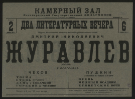 Два литературных вечера. Лауреат Всесоюзного конкурса мастеров художественного слова Дмитрий Николаевич Журавлев (Москва), Пятница, 2 Февраля, Вторник, 6 Февраля 1945 г. : [афиша] / Камерный зал Ленинградской государственной Филармонии