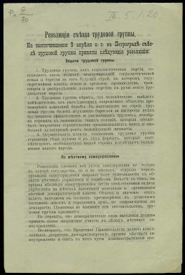 Резолюции съезда трудовой группы. На закончившемся 9 апреля с. г. в Петрограде съезде группы приняты следующие резолюции... : [листовка]