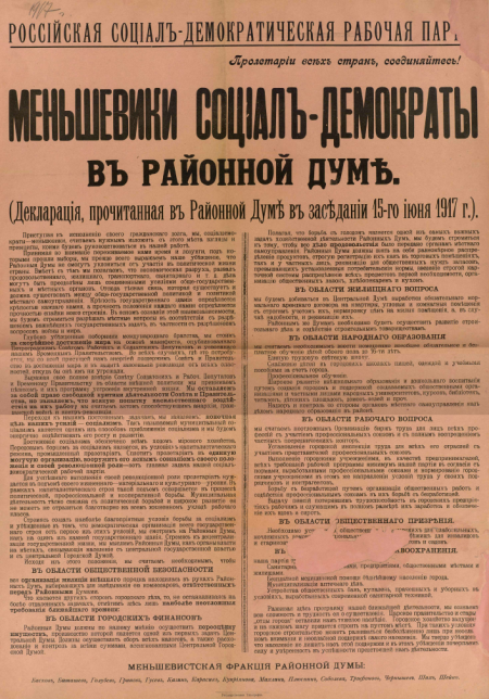 Меньшевики социал-демократы в районной думе. (Декларация, прочитанная в Районной Думе в заседании 15-го июня 1917 г.) : [листовка] / Российская социал-демократическая рабочая партия
