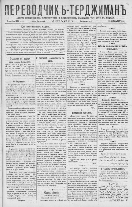 Сводное описание: Переводчик : Газ. лит., полит. и коммер. / Ред.-изд. И.ГаспринскийЯзык: русский ; татарский ; тюркские.Выходные данные: Б. м., 1905Коллекции Электронной библиотеки: Периодические издания -- ГазетыКоллекция: Национальная библиография Тип экземпляра: Выпуск газетыНет реальных экземпляров для этой записи