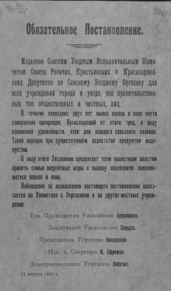 Обязательное постановление, изданное Севским уездным исполнительным комитетом Совета рабочих, крестьянских и красноармейских депутатов по Севскому уездному оргасеву для всех учреждений города и уезда, как правительственных, так общественных и частных лиц, 11 авг. 1919 г. : [об удобрении полей навозом; листовка]