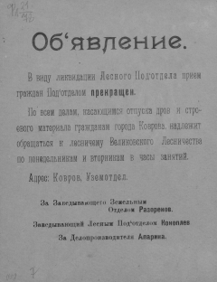 Объявление. "В виду ликвидации лесного подотдела прием граждан подотделом прекращен ..." : [листовка]