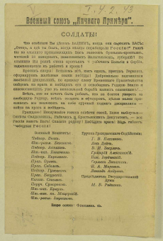 Другие варианты заглавия: : Что ответите Вы детям Вашим когда они спросят Вас: "Отец, а где ты был, когда немцы порабощали Россию?...Дополнительное заглавие, применяемое каталогизатором: : Призыв продолжать войну • От Февраля к Октябрю : листовкиЯзык: русский.Выходные данные: [Петроград, Петроградская губ. : б. и., 1917, май]Физическая характеристика: [1] л. ; 23x15 см.Примечания: Подписи: Военный Комитет: Подпор. Волк, Шт.-Ротм. Безсонов, Подпор. Астахов, Шт.-кап. Кониченко, Подпор. Кириленко, Прап. Орлов, Прап. Соболев, Подпор. Гужагин, Прап. Богурский, Кап. Соколов, Поруч. Сумароков, Шт.-кап. Браун, Шт.-кап. кн. Мещерский, Шт.-ротм. Иевреинов; Группа Гражданского содействия: Г.В. Плеханов, Лев Дейч, В.И. Засулич, Григорий Алексинский, Николай Иорданский, Герман Лопатин, Н.А. Морозов, Леонид Андреев; Председатель Государственной Думы М.В. Родзянко; Коллекция листовок "От Февраля к Октябрю" (3 экз.).Примечание о содержании: Призыв продолжать войну Предметная рубрика - Географическое наименование: Россия -- История -- 1917 -- ЛистовкиДругие классификации: Т3(2)524.2,011 ; Т3(2)711.19-68,011 ; Ц35(2)711,011Коллекции Электронной библиотеки: 1917: от Февраля к Октябрю -- Листовки 1917 годаКоллекция: Национальная библиография Тип экземпляра: КнигаПодписи: Военный Комитет: Подпор. Волк, Шт.-Ротм. Безсонов, Подпор. Астахов, Шт.-кап. Кониченко, Подпор. Кириленко, Прап. Орлов, Прап. Соболев, Подпор. Гужагин, Прап. Богурский, Кап. Соколов, Поруч. Сумароков, Шт.-кап. Браун, Шт.-кап. кн. Мещерский, Шт.-ротм. Иевреинов; Группа Гражданского содействия: Г.В. Плеханов, Лев Дейч, В.И. Засулич, Григорий Алексинский, Николай Иорданский, Герман Лопатин, Н.А. Морозов, Леонид Андреев; Председатель Государственной Думы М.В. Родзянко