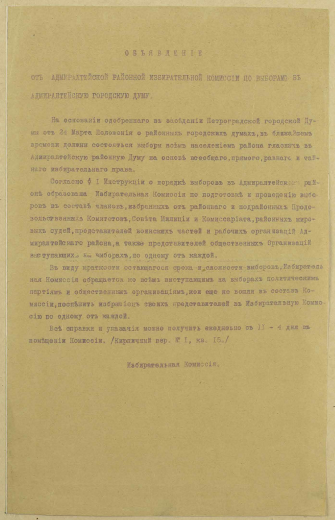 Объявление о предстоящих выборах в Адмиралтейскую районную думу Петрограда