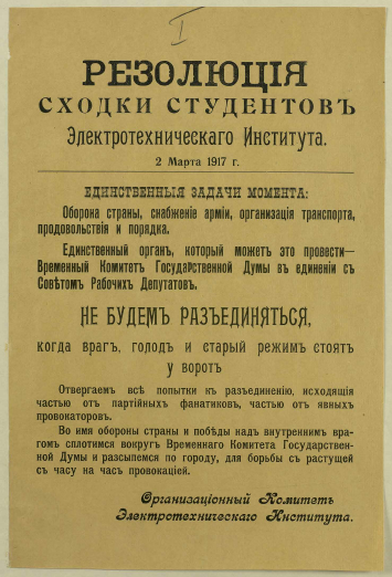 Резолюция сходки студентов Электротехнического института, 2 марта 1917 г. : [листовка]