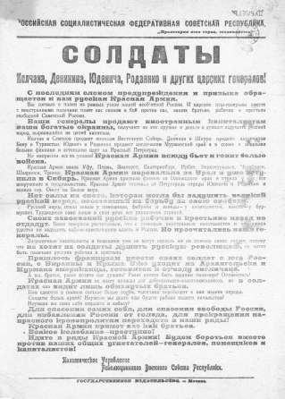 Солдаты Колчака, Деникина, Юденича, Родзянко и других царских генералов! "С последним словом предупреждения и призыва обращается к вам русская красная Армия..." : [листовка]
