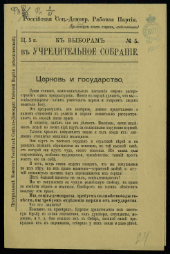 К выборам в Учредительное собрание. Церковь и государство : [листовка] / Российская соц.-демокр. рабочая партия, Центральный комитет Российской социал-демократ. рабочей партии (объединенной)