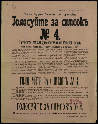 Рабочие, солдаты, граждане и все трудящиеся, Голосуйте за список № 4 Российской социал-демократической рабочей партии (меньшевики, объединенцы, "Бунд", Латышская с.-д. организ. "Утро") : [листовка]