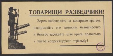 Товарищи разведчики! Зорко наблюдайте за коварным врагом, раскрывайте его замыслы, безошибочно и быстро засекайте цели врага, правильно и умело корректируйте стрельбу! : [призыв]