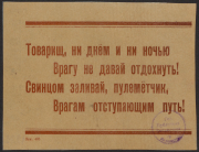 Товарищ, ни днём и ни ночью врагу не давай отдохнуть! Свинцом заливай, пулеметчик, врагам отступающим путь! : [призыв]