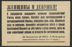 Женщины и девушки! В совершенстве овладевайте военными специальностями! Учитесь метко стрелять. Изучайте дело противовоздушной и противохимической обороны, санитарное дело, связь. Обеспечьте уход за ранеными, проявляйте материнскую заботу о семьях фронтовиков! Возьмите на себя заботу о детях-сиротах, пусть ни один осиротевший ребёнок на останется без материнской ласки : (из Постановления ЦК ВКП(б) "О Международном коммунистическом женском дне - 8 марта"); [призыв]