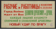 Рабочие и работницы лесозаготовок и сплава! Город Ленина ждет от Вас деловую древесину и дрова. Каждый лишний кубометр сплоченной и сплавленной древесины - новый удар по врагу : [призыв]